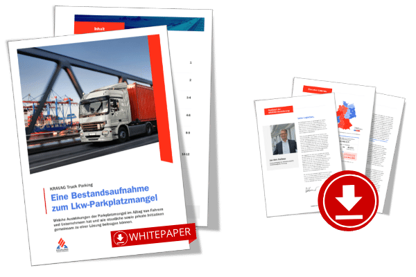Bis zum Jahr 2023 fehlen in Deutschland pro Nacht rund 40.000 Lkw-Parkplätze. Allein der Ausbau öffentlicher Parkplätze reicht nicht, um das Problem kurzfristig zu lösen. Genau das bringt das neue Whitepaper vom KRAVAG Truck Parking, dem Bundesverband Güterverkehr Logistik und Entsorgung (BGL) und der Universität Duisburg-Essen auf den Punkt. Zusätzliche innovative Konzepte sind gefragt – und Unterstützung durch die Bundesregierung. In unserem Whitepaper erfahren Sie wie Sie aktiv werden und konkret handeln können.